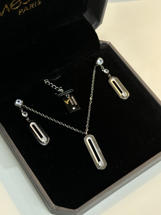 سلسال مع حلق مستوحاة من ميسيكالون فضي مزين بكريستاله كبيرة بالحلقوكريستالة صغيرة بالسلسال مه نهاية بشعار الماركة.مصنوع من الستانلس ستيلس (فولاذ مقاوم للصدأ) بطلاء الفضة