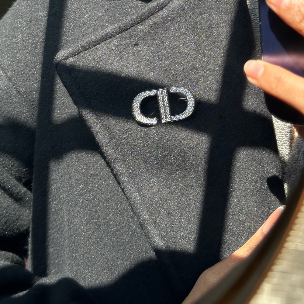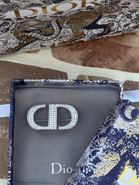 بروش فضي من Christian Dior يتميز بتصميم أنيق وخالدمزين بالكريستالات البيضاء الصغيرة.مصنوع من الستانلس ستيل (فولاذ مقاوم للصدأ).