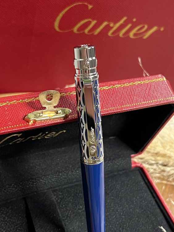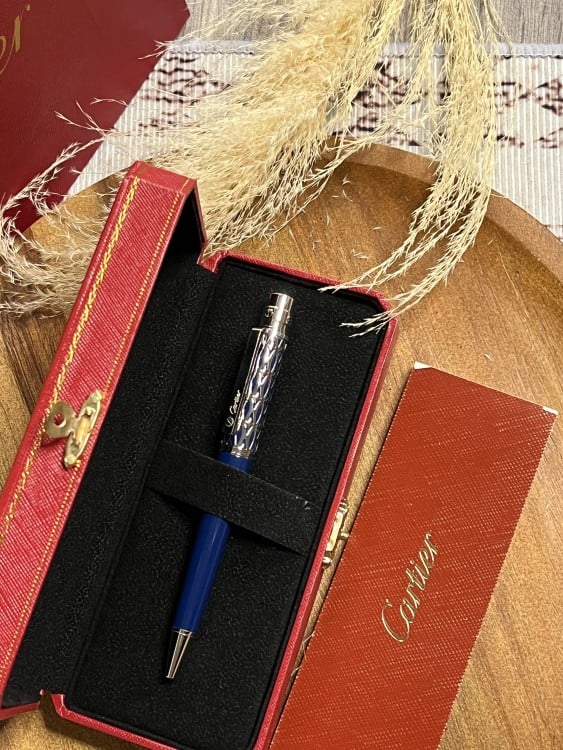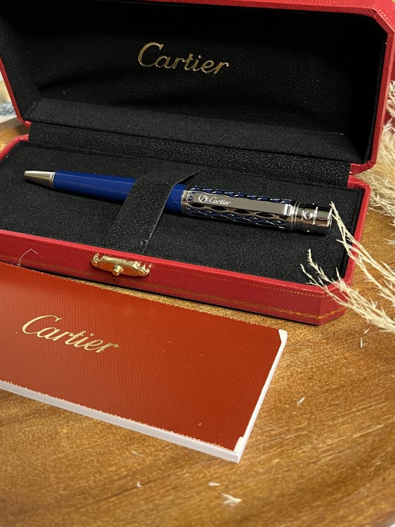 قلم حبر جاف (بولبوينت) من مجموعة "سانتوس دو كارتييه"، موديل الحجم الكبير، غطاء من المعدن المنحوت والمطلي باللّكر باللون الأزرق والمزيَّن بزخرفة "ديكور دابِل سي"، مطلي باللّكر باللون الأزرق، براغي من المالاكيت، طلاء بالبلاديوم. المقاييس: 140.5 × 12.9 مم. يأتي مع عبوة حبر أسود متوسّطة الحجم لقلم حبر جاف (بولبوينت). تتيح لك كارتييه إمكانية إضفاء الطابع الشخصي على أداة الكتابة الخاصة بك.