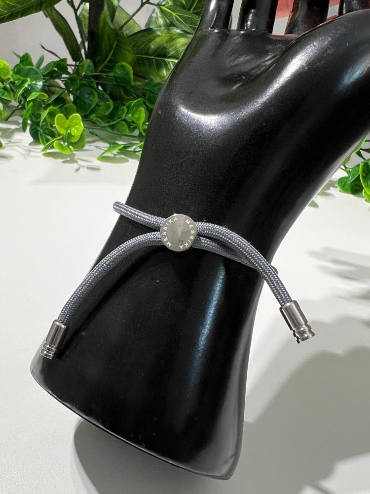 ضمان سنة على اللون!!اسوارة بتصميم حصري من ميسكيامصنوعة من الستانلس ستيل المقاوم للصدأ وجودة عالية جداً .معدن بشعار الماركة باللون الأسود مع ختم الماركة في المعدنبالاضافة الى فصوص كرستالخيط ازرق قابل للتعديل
